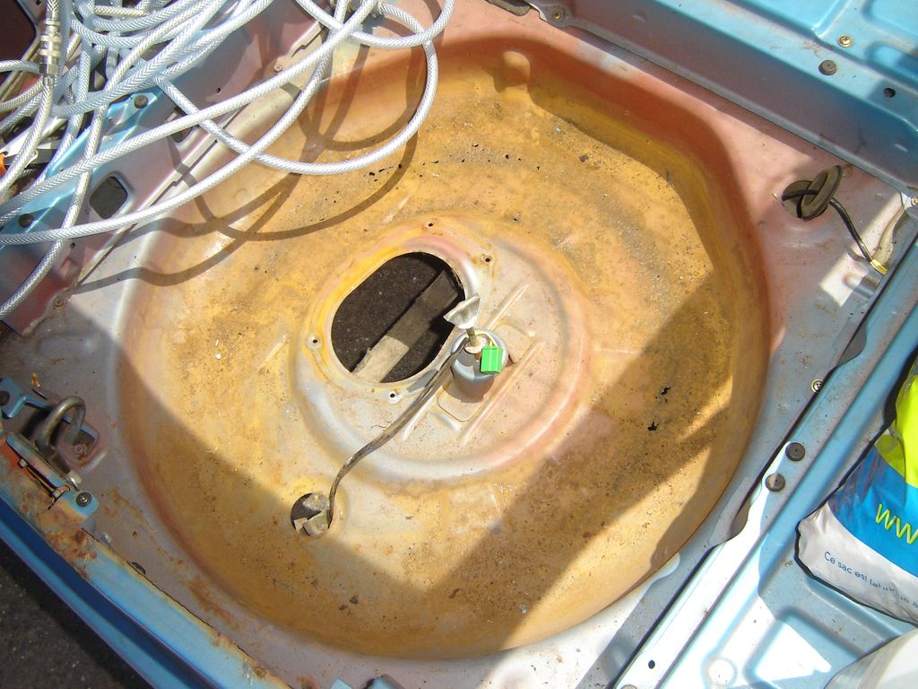 On essaye d'en traiter un maximum et petit à petit je démonte chaque pièce pour les repeindre; enfin bon, je fais ce que je peux car je suis pas du métier. Pour les parties les plus rouillés (trappe de roue de secours, bas de portière passager et support de feux arrière) on va les décaper un maximum à la brosse métallique et au papier puis on va les badigeonner d'un produit dont je ne me rappelle pas le nom;